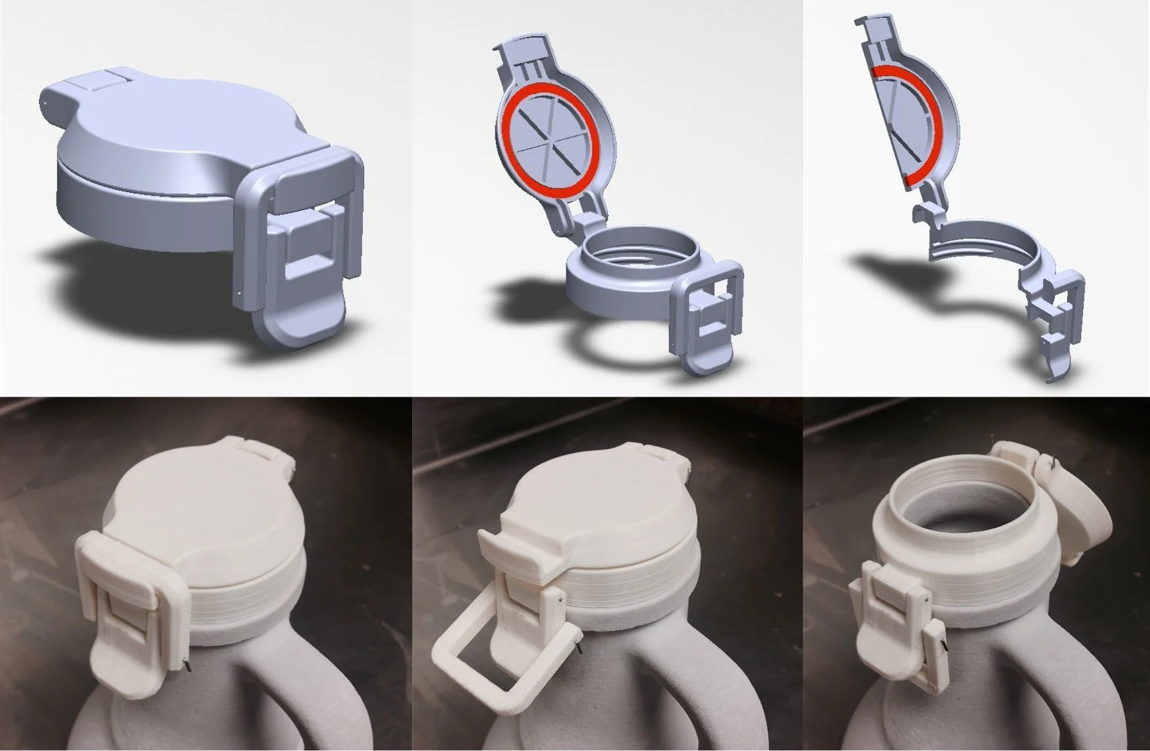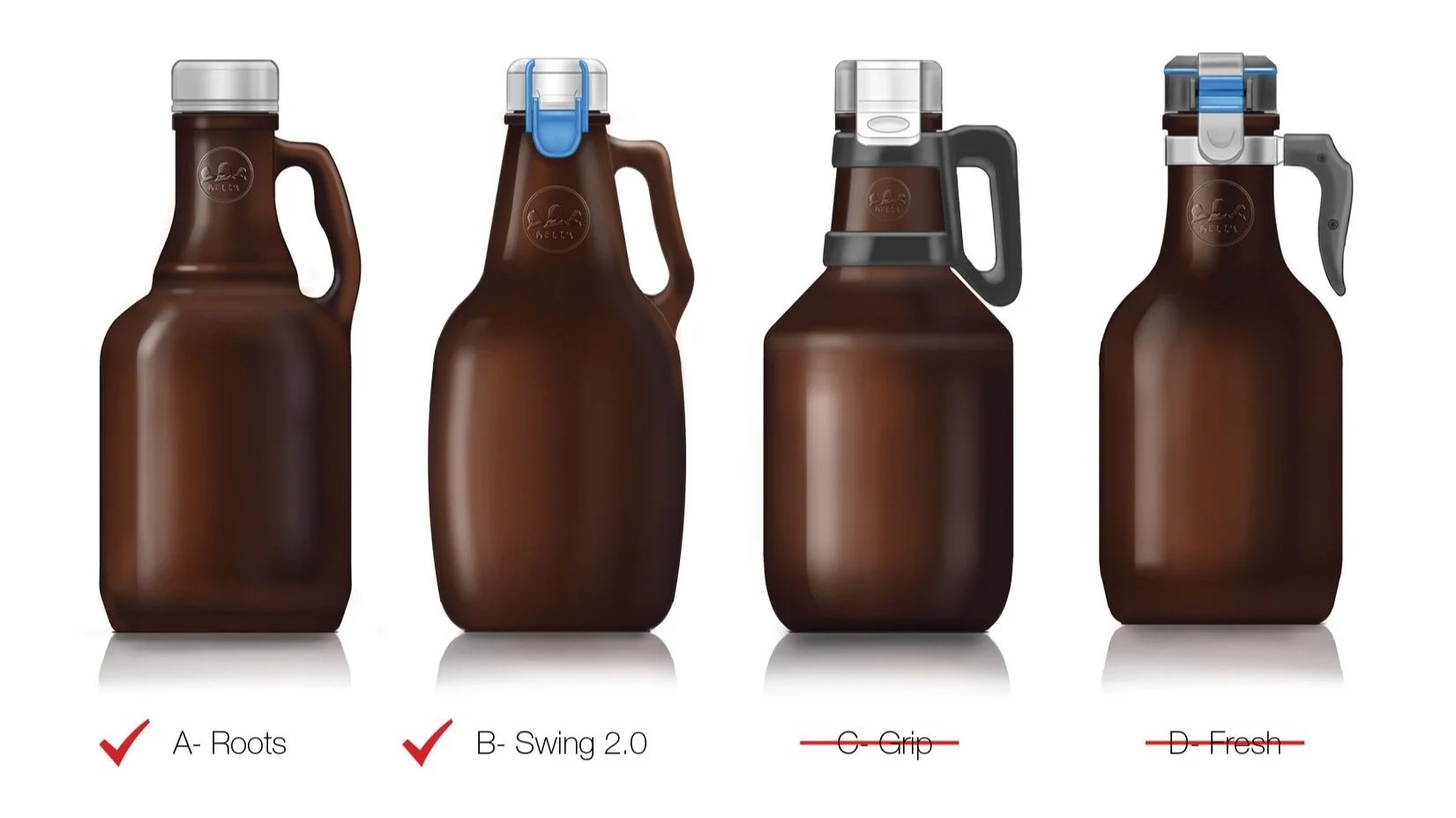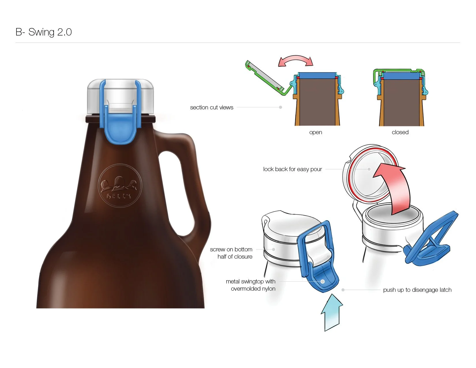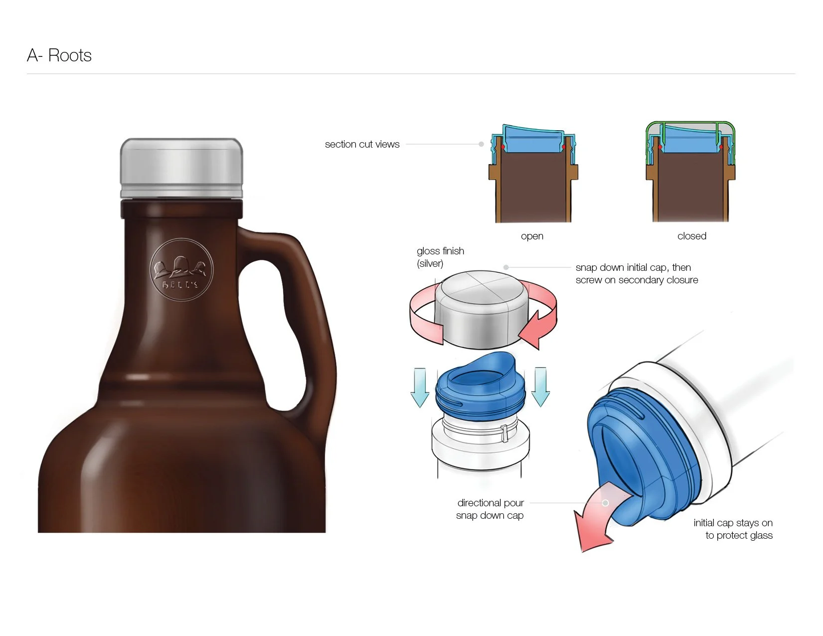 Once they had narrowed down to the Roots concept (shown left above), I revisited the development of a custom closure that would essentially be a modern swing-top design. Again by printing multiple prototypes, I was able to narrow in on a design direction and develop a solid proof of concept before handing it off to the engineering team.