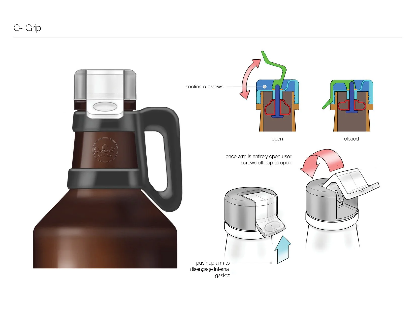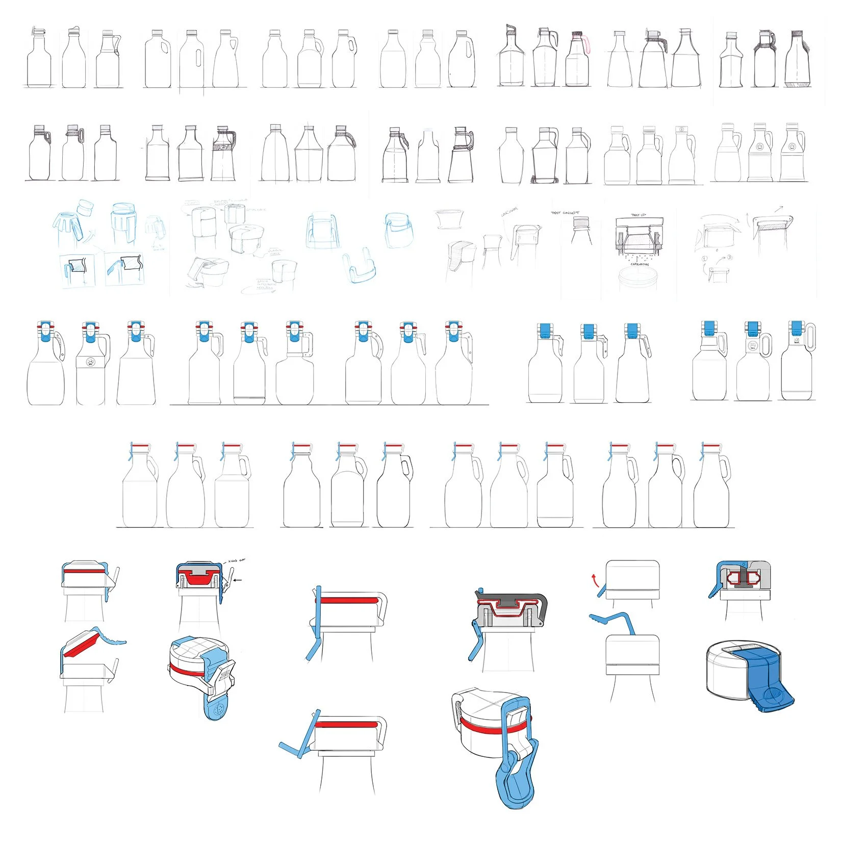 Once our design parameters were set, I began sketching concepts that were focused around a few key ideas: Increase the neck opening to help with pouring and filling. And modularity, an idea that could be added to Grandstand's business model by offering custom closures as an upgrade to their customers.