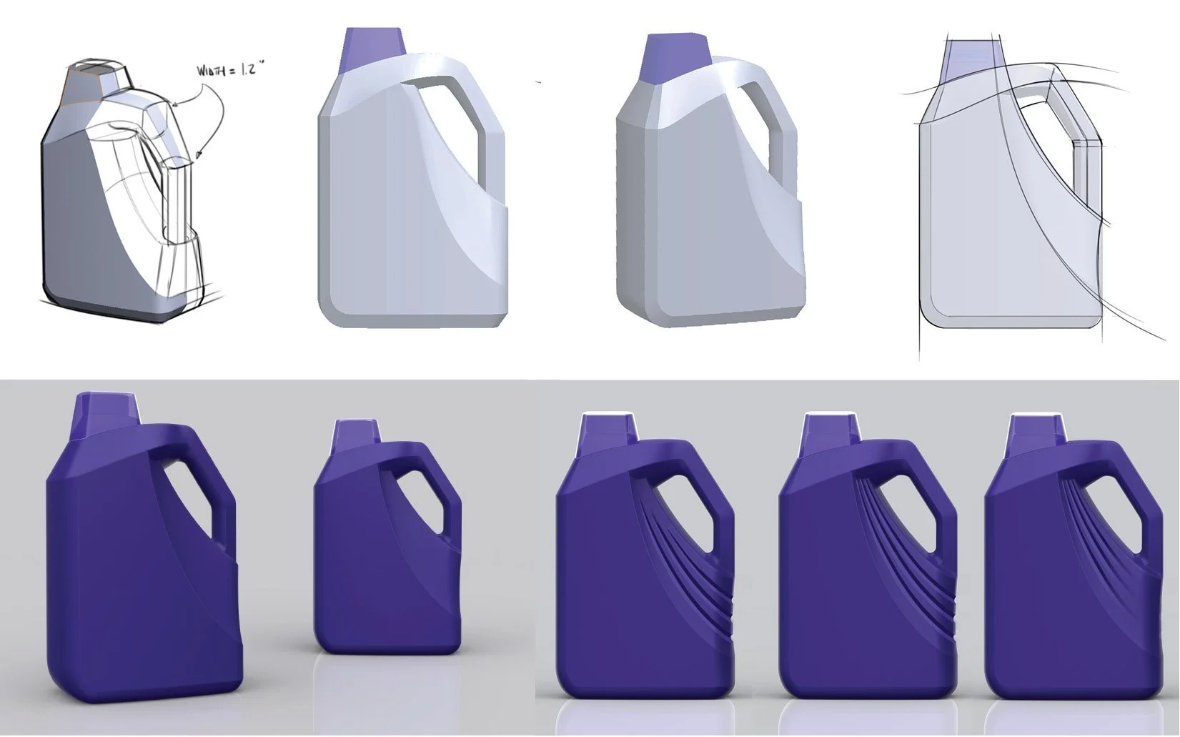 After Roto- Rooter had narrowed down to one concept we moved into CAD development of the bottle to begin understanding the volumetric capacity of our design and how the bottle and over cap would coexist together.This allowed me to provide a solid foundation for engineering to fully flesh out how the over cap would snap on.